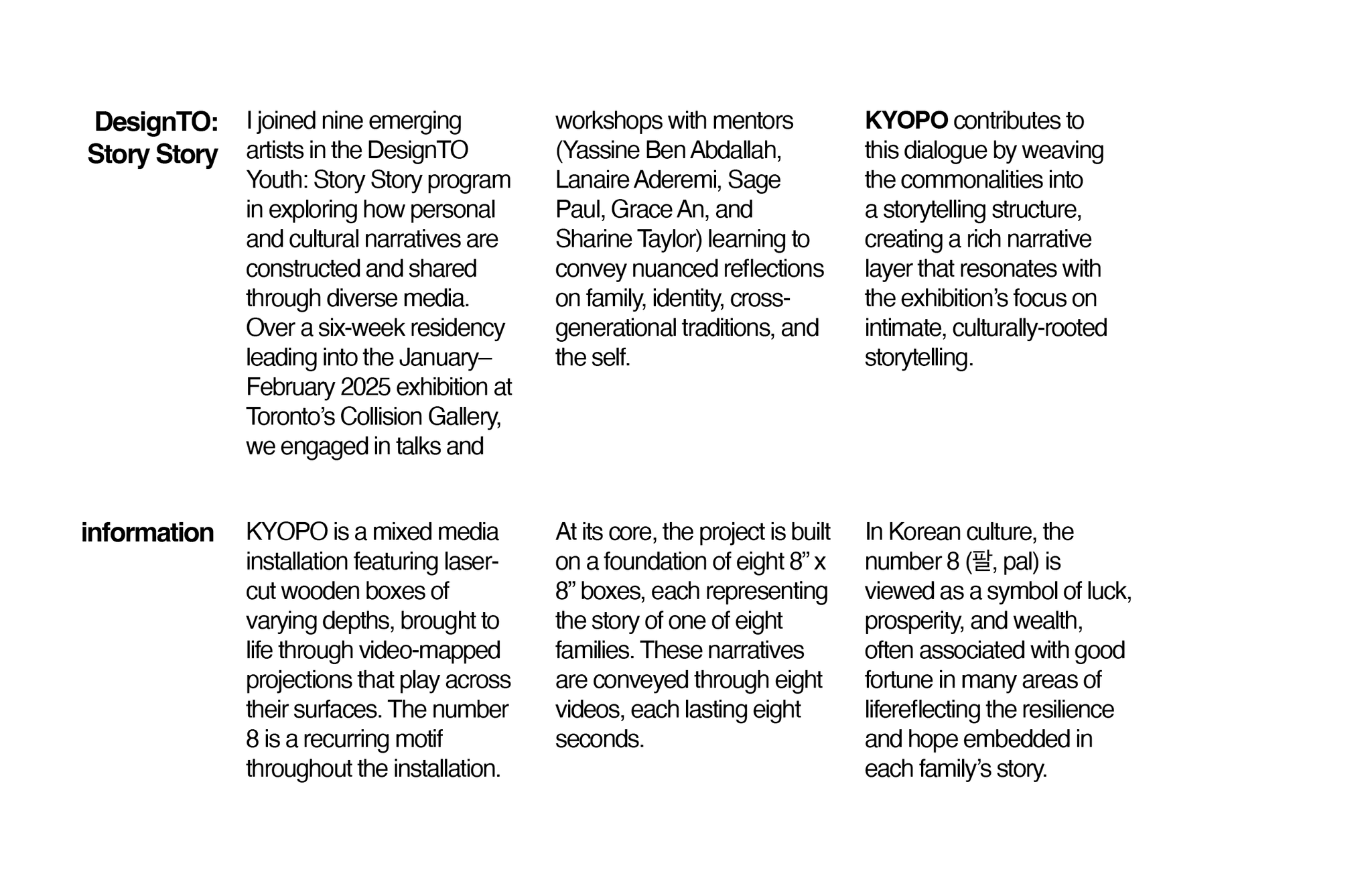 While the installation itself presents each family’s story in an abstract, immersive form, these pages provide viewers with an opportunity to pause, reflect, and engage with the narratives on a deeper level. By highlighting key moments and themes, the pamphlet bridges the gap between the poetic visual experience and the personal realities behind it, allowing audiences to connect more intimately with the families’ voices and histories.
