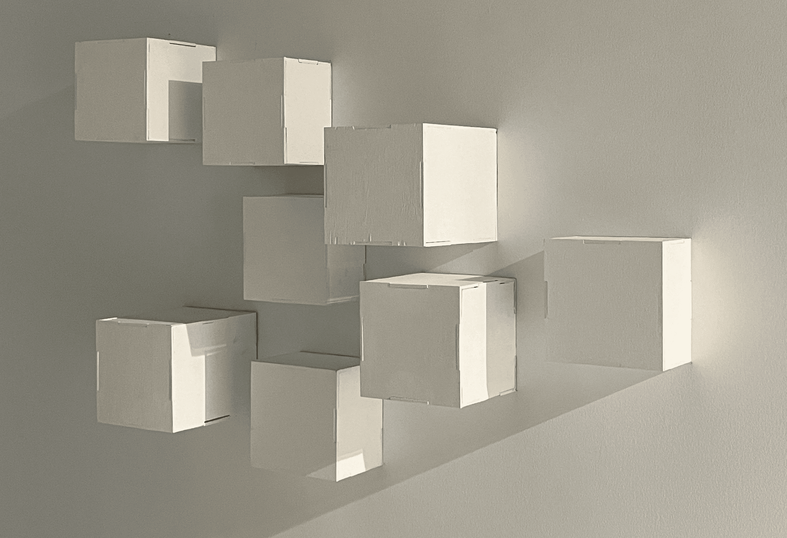 KYOPO is a mixed media installation featuring laser-cut wooden boxes of varying depths, brought to life through video-mapped projections that play across their surfaces. The number 8 is a recurring motif throughout the installation.